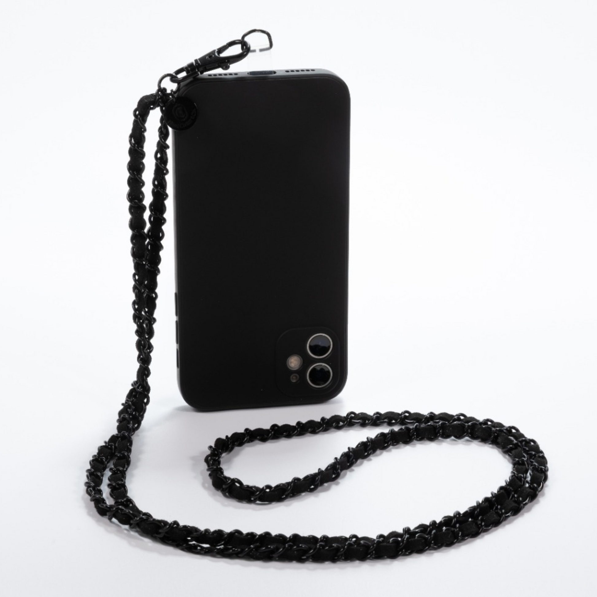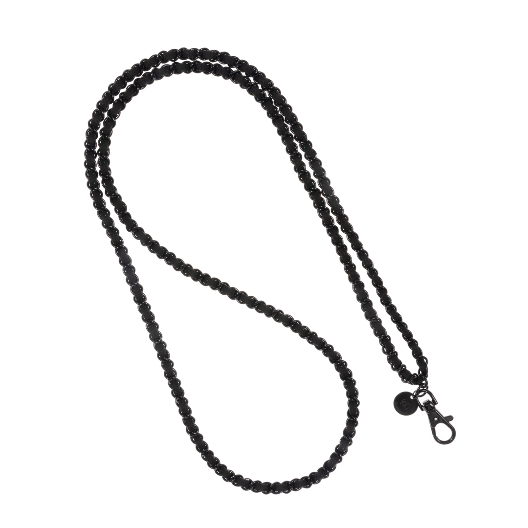 Matte Black Crossbody Phone Chain with 100% Black Suede Woven Throughout. With Phone Chains this chic, there has never been a more convenient, lightweight, and fashionable way to keep your phone with you; hands-free.