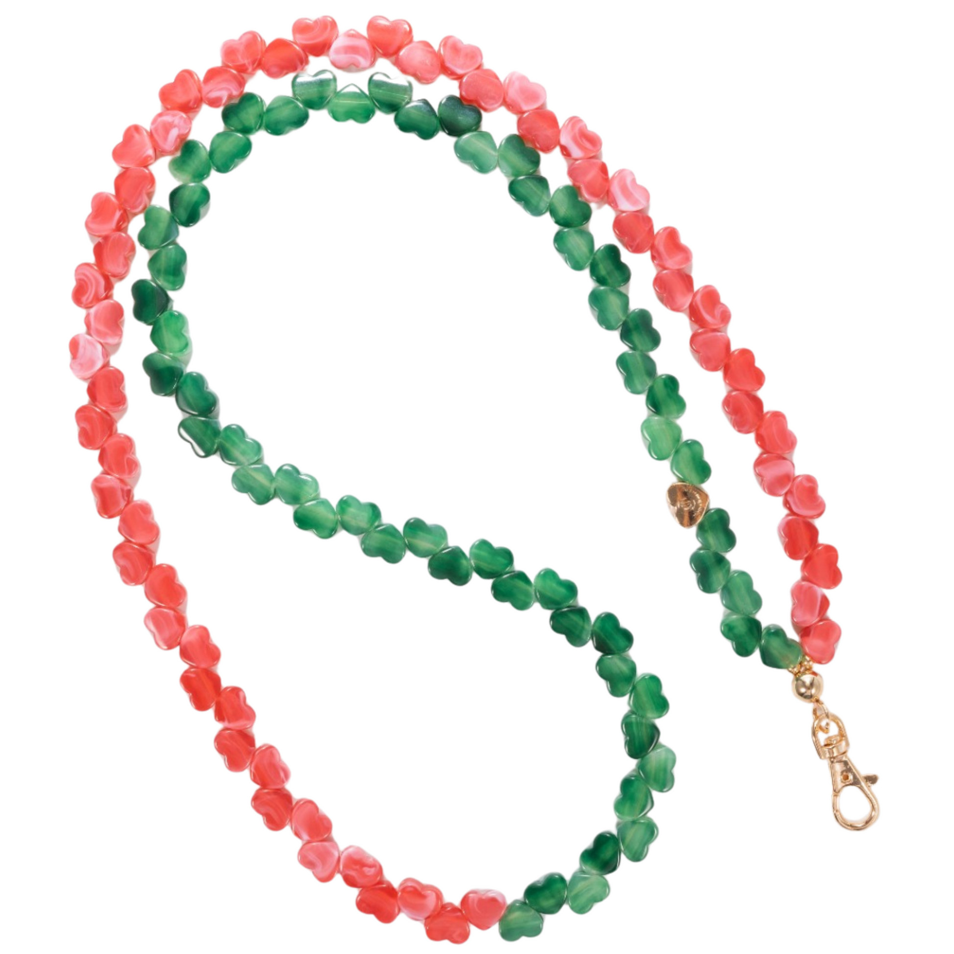 Crossbody Phone Chain featuring acrylic beaded hearts with 18K gold plated branded charm heart and clasp.