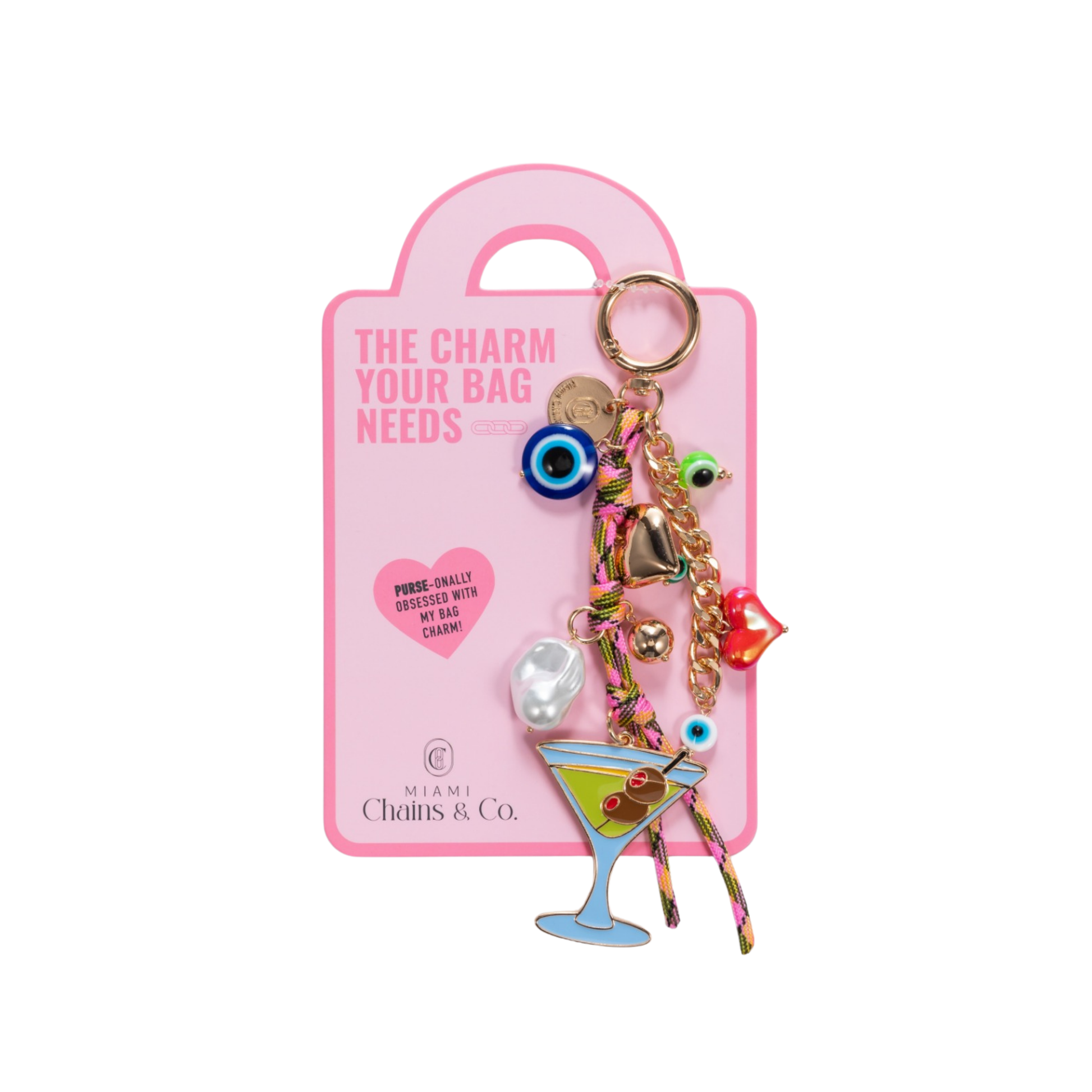Bag charm featuring 14k gold plated chain, charms, pearls and evil eyes with jumbo hand painted martini pendant and woven nylon cord.