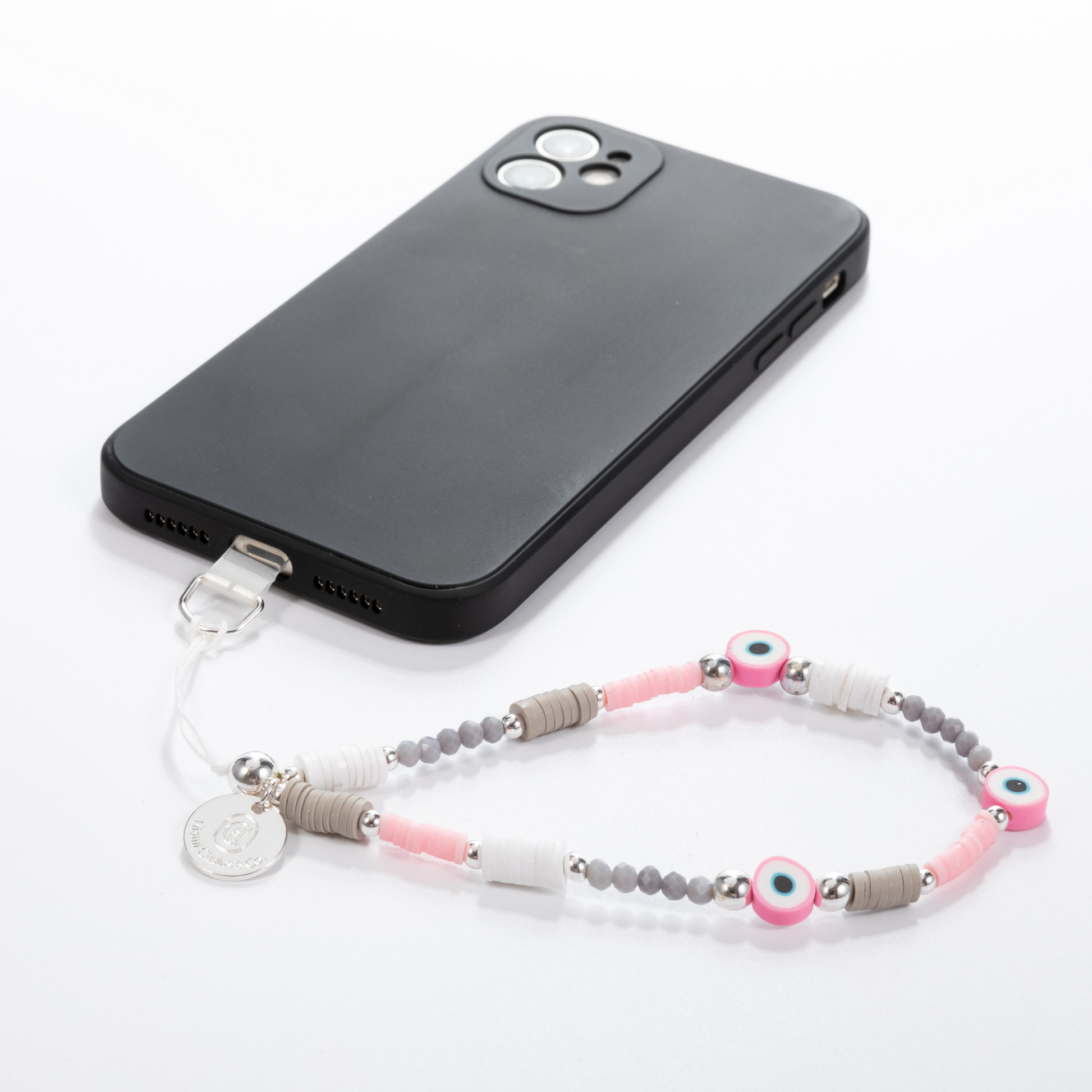 Phone Charm Wristlet featuring Baby Pink, White & Pastel Gray Heishi Beads w/ Evil Eyes