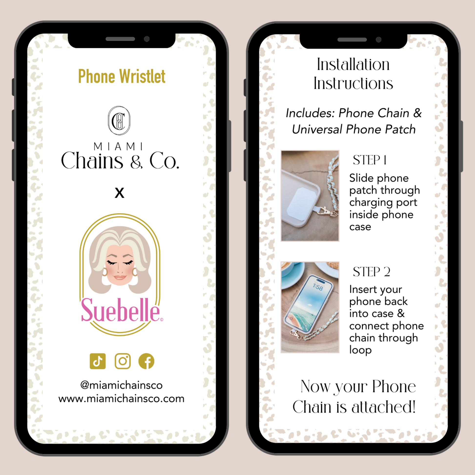 - Each chain comes with an ultra-thin phone patch that comfortably fits between any phone and its case, enabling you to connect the chain to the patch through the charging port.