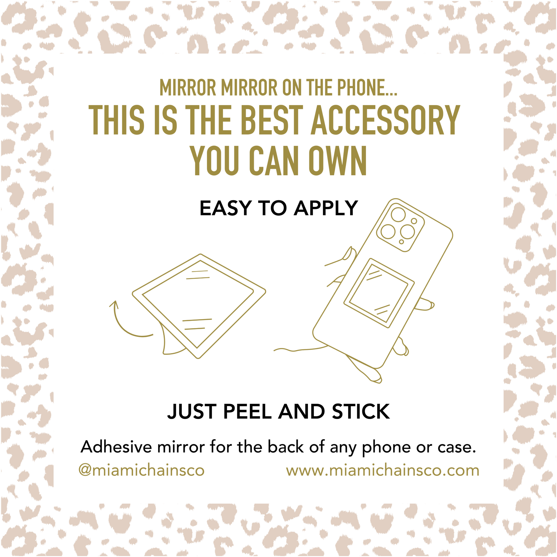 Suebelle x Miami Chains & Co Phone Mirrors are adhesive mirrors that adhere to the back of all phones and cases. No more searching through your handbag for a mirror. A must-have accessory!