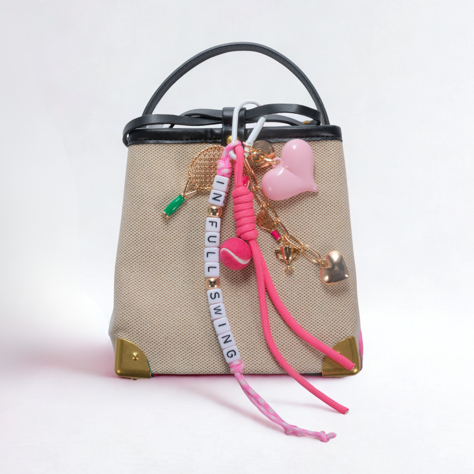 Multi-Strand Bag Charm featuring 18k Gold Plated Racket Sports Charms adorned on Chain Links and Neon Nylon Cord with Beaded Lettering.