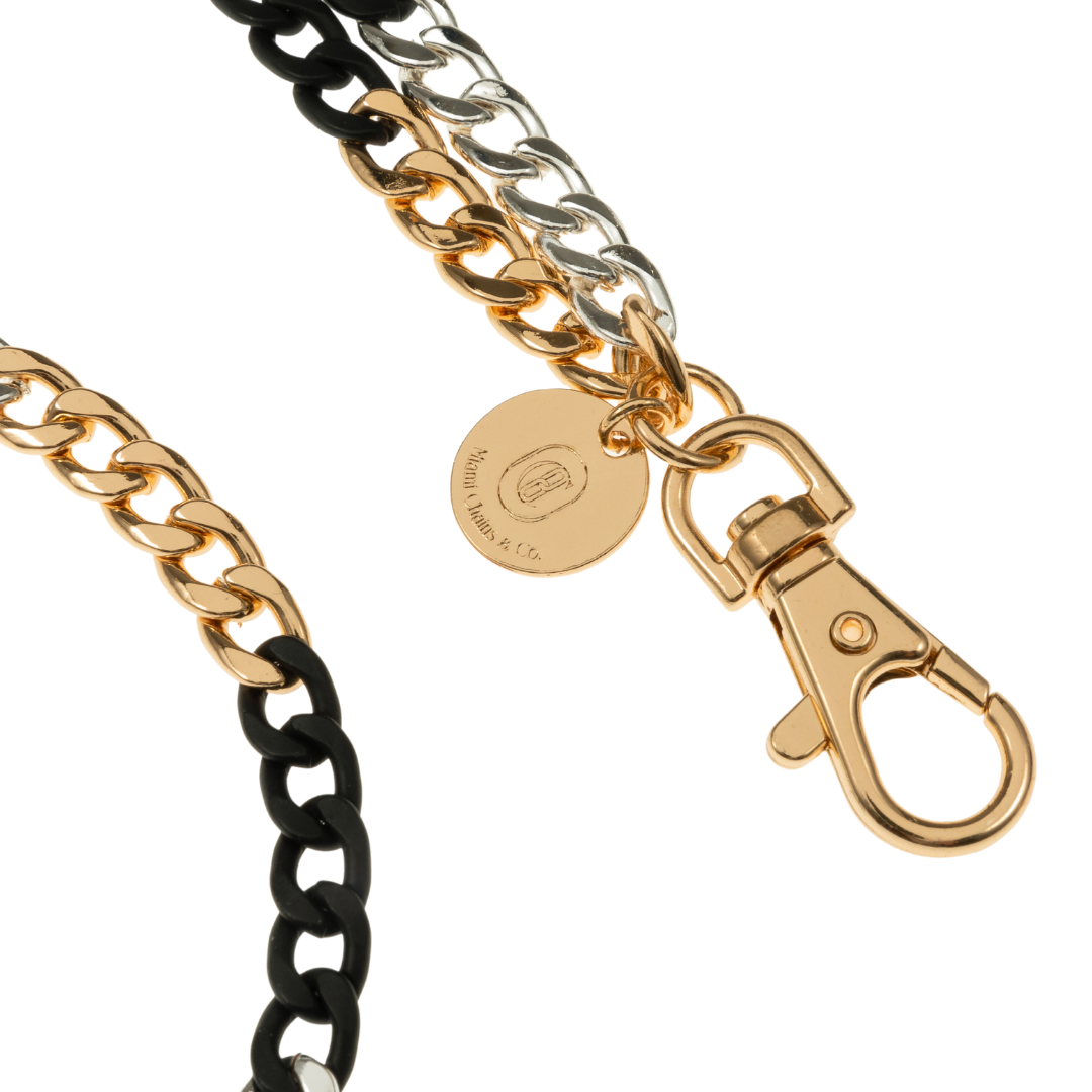 Cuban Link Chain composed of Gold, Silver and Matte Black links. With Phone Chains this chic, there has never been a more convenient, lightweight, and fashionable way to keep your phone with you; hands-free.